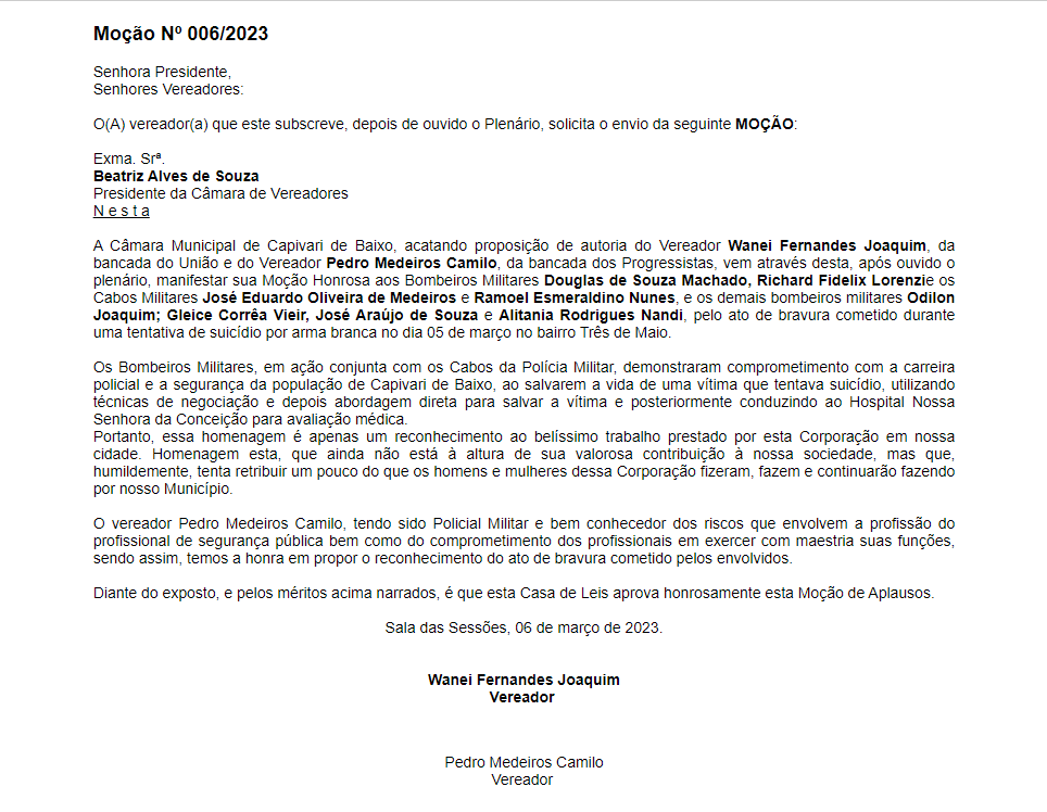 Bombeiros Militares de Capivari de Baixo, no sul do Estado, receberam, nessa segunda-feira (06/03), Moção de Aplausos da Câmara de Vereadores do município. A homenagem, proposta pelos vereadores Pedro Medeiros Camilo e Wanei Fernandes Joaquim, foi realizada após os profissionais resguardarem a vida de uma mulher transgênero que se mutilava com uma faca e tentava tirar a própria vida.